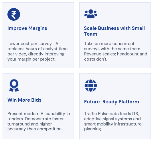 Traffic Survey Intelligence helps surveyors work faster, reduce effort, improve accuracy, and increase profitability—without changing how surveys are conducted on the ground.